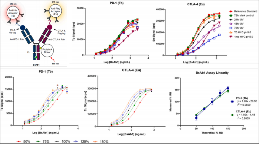 2.瑞孚迪基于AlphaPlex™技术,使用不同荧光微球(Eu/Tb),通过捕获不同的发射波长区分Eu/Tb微球信号,可在同一反应中同时检测BsAb与两个不同靶点的结合。AstraZeneca开发的BsAb AlphaPlex方法在50~150%线性范围内表现出99%~107%的准确率,并检测到光应激和热应激条件下>50%的结合降解。此方法适用于BsAb的先导分子筛选、PK/PD分析、临床相容性、商业批次放行和稳定性测试等。