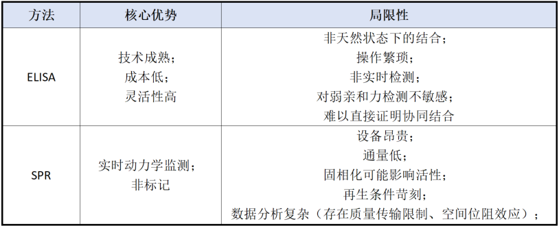 双抗结合活性的检测绝非两个单抗检测的简单叠加。它是一个需要精心设计、相互验证的系统工程,旨在确保双抗分子不仅能结合两个靶点,而且是以正确的结构、恰当的比例和期望的方式同时结合,从而驱动其预期的生物学功能。因此,无论是在检测方法的开发、验证还是在整个质控流程中,其复杂性和挑战性都远高于单抗。传统表征方法,如酶联免疫吸附测定(ELISA)和表面等离子共振(SPR),虽技术成熟,但在BsAb的应用中存在明显瓶颈:固相界面效应、难以模拟协同结合、操作繁琐、通量有限。