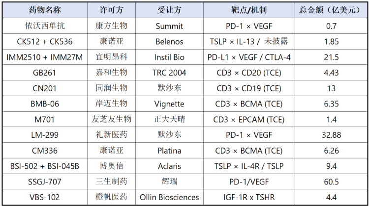 目前,全球已有22款BsAb药物获批上市,主要集中在肿瘤领域。2024年全球BsAb市场规模约130亿美元,预计到2032年将爆发式增长至2246亿美元。仅2025年上半年,中国BsAb License-out交易总额就高达92.57亿美元,CD3靶向的TCE双抗、PD-1/VEGF双抗等成为热门布局方向。