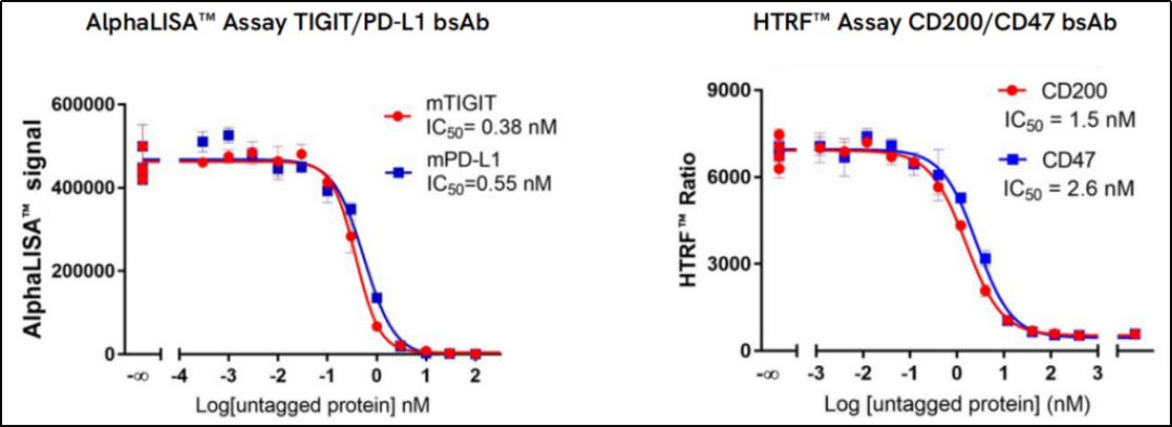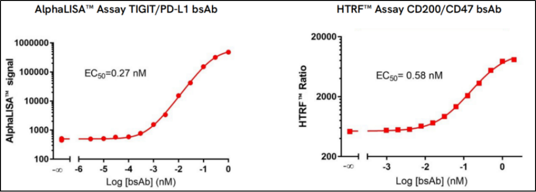 1.使用Alpha/HTRF技术,BsAb结合活性既可通过设置不同的结合实验获得BsAb结合活性的EC50值(三元复合物-夹心法,图4,5),或BsAb筛选的IC50值(竞争法,图6),其灵活的检测模型满足了客户对BsAb结合活性验证的个性化要求。