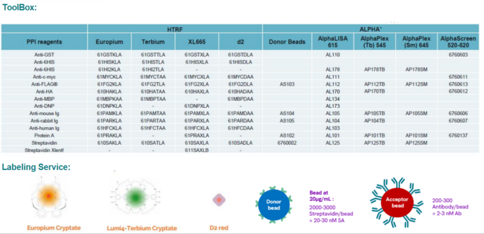 不同结构类型的BsAb都可以使用HTRF/Alpha技术来表征结合活性,以IgG样BsAb为例,其结合活性可通过带有不同标签的抗原(如生物素化抗原与His标签化抗原)及相应标签抗体的toolbox试剂进行评价。